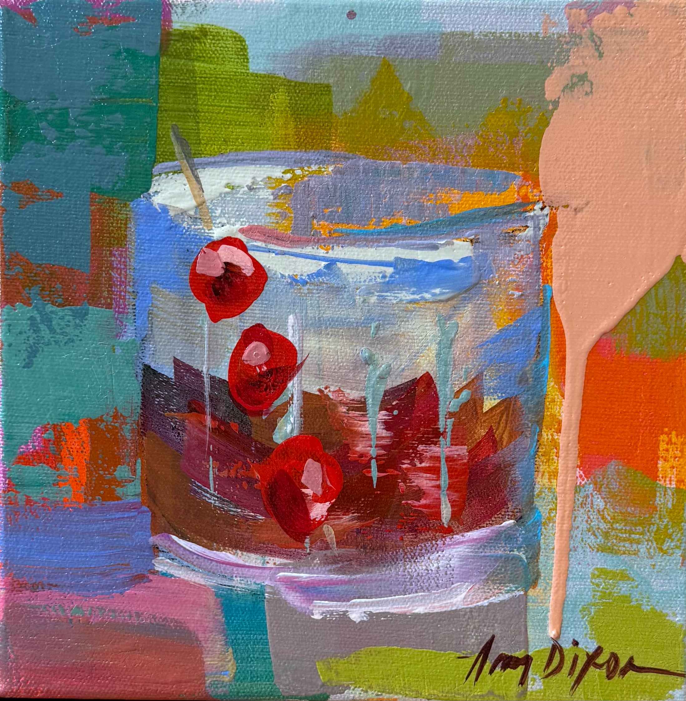 Amy Dixon’s paintings are filled with energy and joy. Her spontaneous brushwork and bold use of color reflect her love for life. Her art, full of rich layers and textures, shows her passion for creativity. Dixon’s canvases are often bright and lively, expressing her infectious enthusiasm. She loves to play with color and often adds a surprising “pop color,” a bold contrast that brings life to her work.