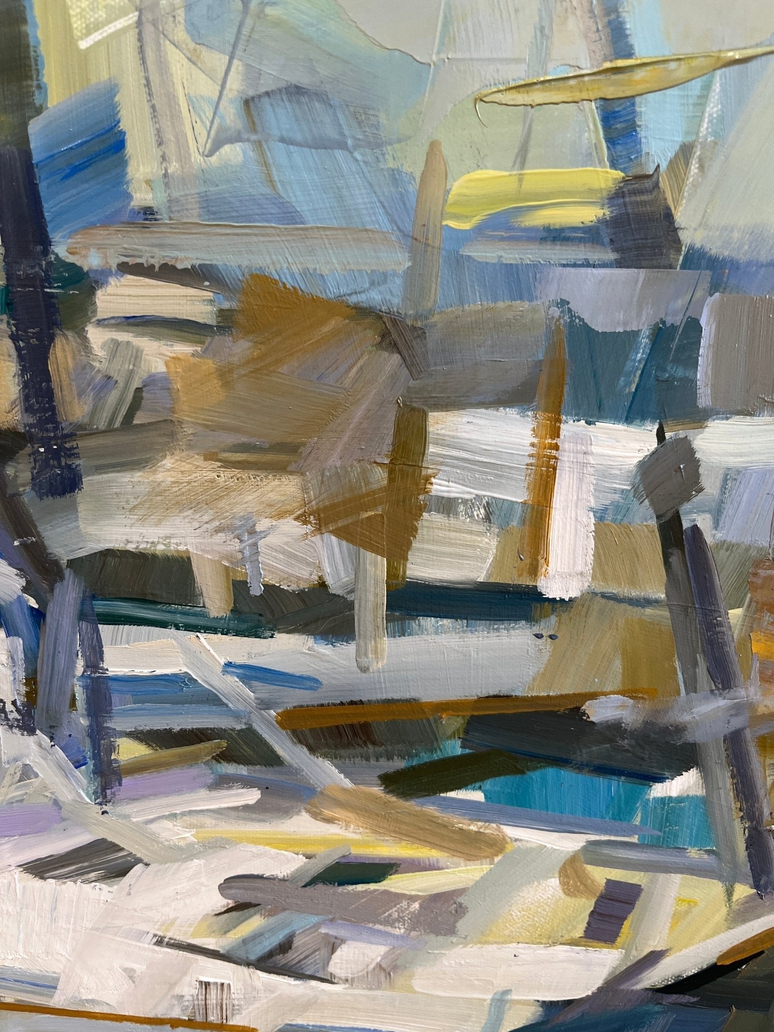 Firstly, look for his use of impasto and scumbling techniques. He layers oil paint to create texture, then carves and gouges with a palette knife, adding a sculptural quality to his work. These techniques result in a unique blend of realism and abstraction.